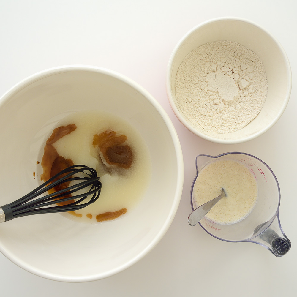 - Beat together the almond milk mixture, oil, sugar, vanilla extract in a large bowl.