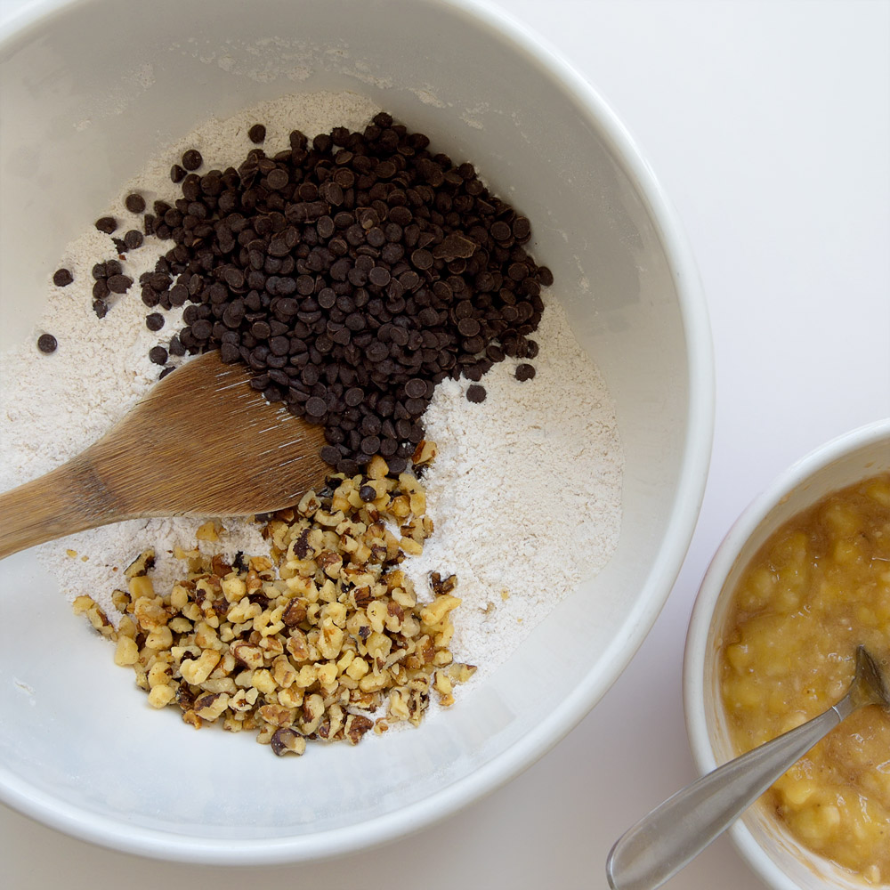 - In a medium bowl mash the bananas, leaving some small chunky bits.